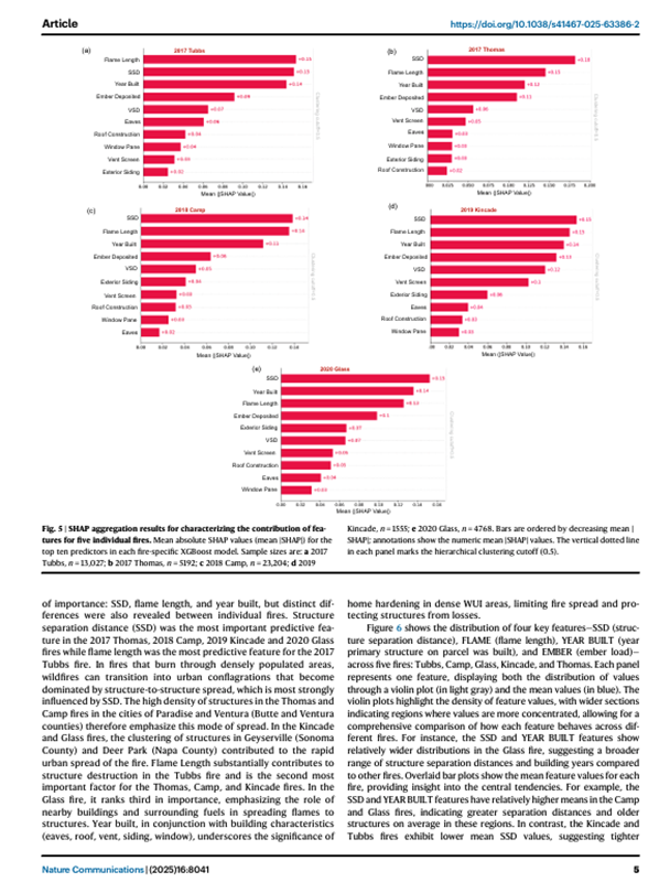(Summer 2025) The destructive impacts of wildfires on people, property and the environment have dramatically increased, especially in the Wildland-Urban Interface (WUI) in California. In these areas structures are threatened by both approaching flames and lofted embers which spread fire into and within communities…In this article, Nature Portfolio and the authors examine five major historical WUI fires—2017 Tubbs, 2017 Thomas, 2018 Camp, 2019 Kincade, and 2020 Glass Fires—utilizing machine learning (ML) analysis of on-the-ground post-fire data collection, remotely sensed data, and fire reconstruction modeling to assess patterns of structure loss and mitigation effectiveness. (Data heavy, but very interesting article)